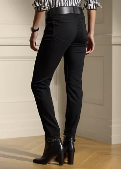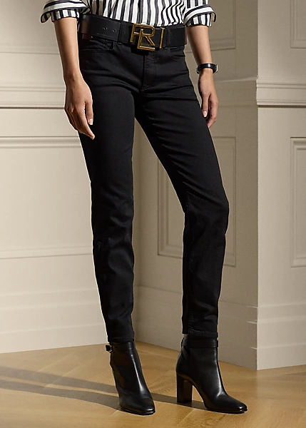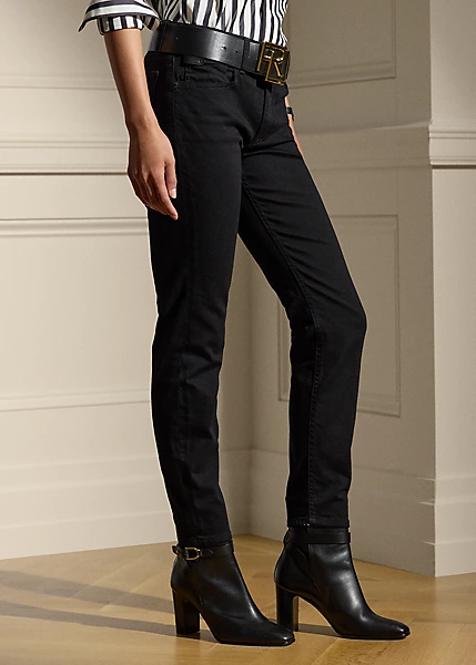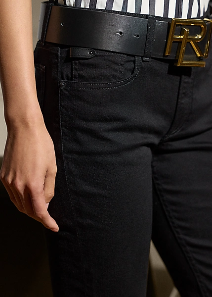 Our ankle-grazing 400 Matchstick skinny jeans are crafted in Italy from stretch-integrated denim that’s specially rinsed and washed to achieve its crisp black hue and soft hand. Continuing Mr Lauren’s theme of detailing the Collection with luxurious leather, this body-shaping pair is finished at the coin pocket with a lambskin tab and at the back with a “Ralph Lauren”-debossed leather patch, each accented with tonal, matte studs.
