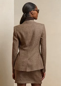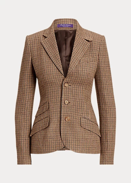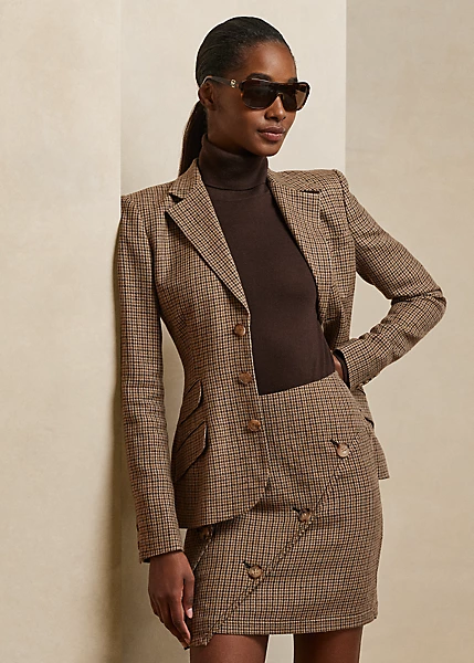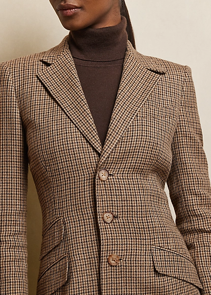 A personification of Ralph Lauren’s iconic style, the Adryan jacket unites equestrian-inspired elements, including hacking pockets and a hacking tab on the collar, with a figure-flattering, ultra-slim silhouette. Accented by genuine horn buttons engraved with “Ralph Lauren”, this timeless jacket is crafted with an Italian silk-blend tweed, which is considered for its remarkable texture and two-tone houndstooth motif.
