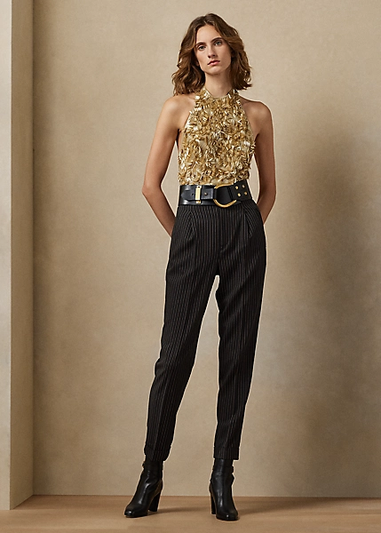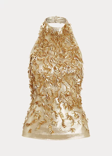 Pre-Fall 2023 Collection is composed of elevated classics, which is brought to life in the Annike blouse. Designed with a halter silhouette, this backless tulle top is lined with metallic jersey and meticulously hand-beaded by Italian artisans with a novel, engineered motif for a dramatic evening look.