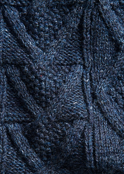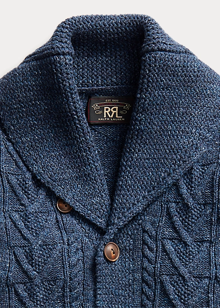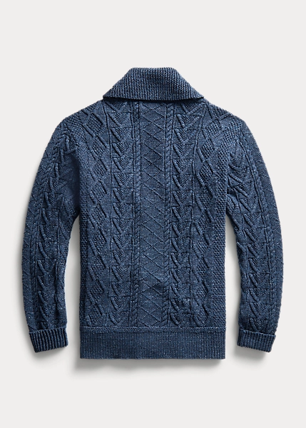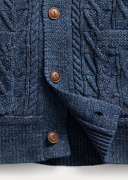 Aran-knit from cotton slub yarn for added texture. Racking stitch details on the collar and placket. Ribbed cuffs and hem. Genuine horn buttons.