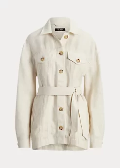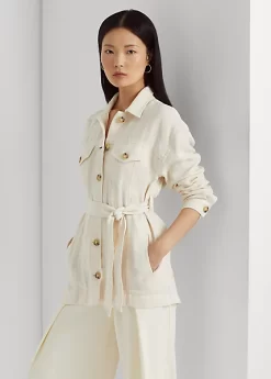 Rendered in lightweight herringbone linen, this jacket unites a streamlined, shirting-inspired silhouette with an effortless self-belt. Sophisticated “Lauren Ralph Lauren”-engraved horn-effect buttons complete the look.