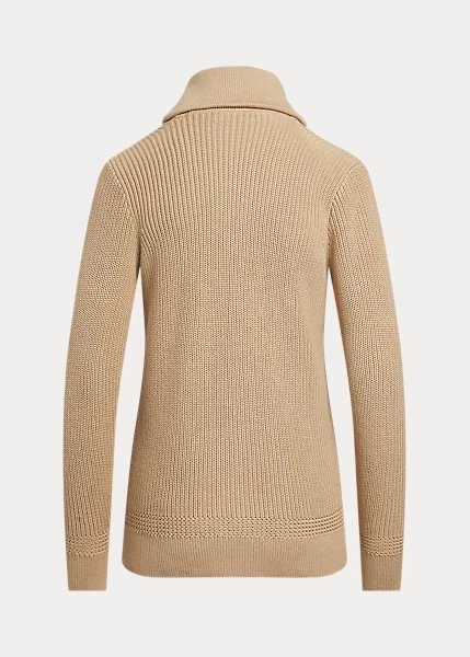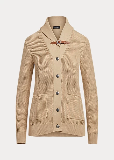 A sumptuous faux-leather buckle and antiqued engraved buttons enhance the sophisticated appeal of this shawl-collar cardigan, which is knit with combed cotton for an unbelievably soft hand. Ralph Lauren partners with Better Cottonâ„¢ to improve cotton farming globally.