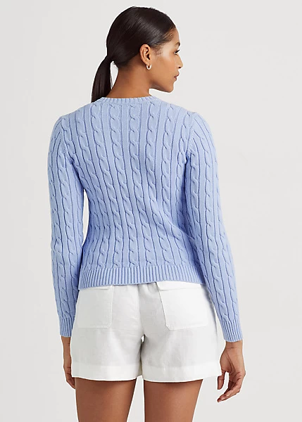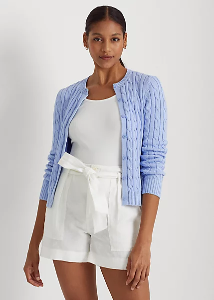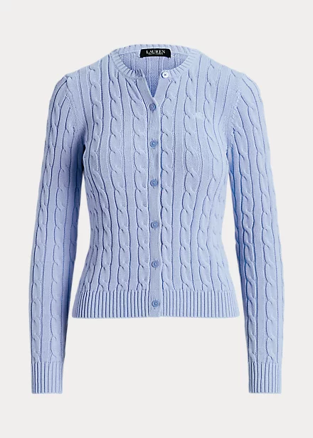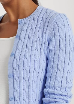 Cut from gassed cotton for an amazingly soft feel, this classic cable-knit cardigan is accented with pearlised signature buttons and an embroidered monogram on the chest for an iconic Lauren Ralph Lauren staple.