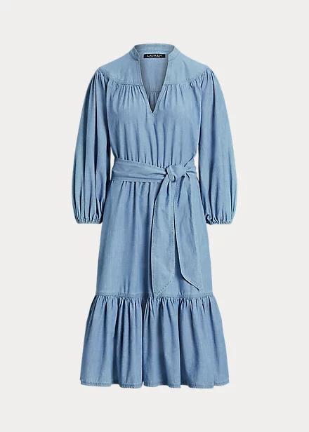 A must-have for the season, this dress balances the casual ease of chambray with feminine styling details, like blouson sleeves, a self-belt and a tiered skirt.