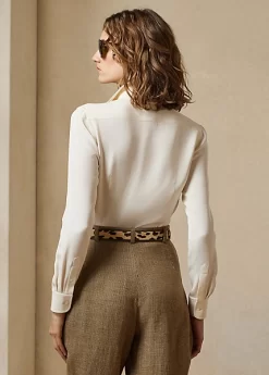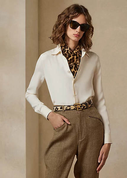 Inspired by the first women’s dress shirt Ralph Lauren introduced in the 1970s, this Italian-made piece combines a slim fit, a high armhole and a face-framing spread collar for a feminine take on a menswear mainstay. Mulberry silk marocain provides a fluid, effortless drape.