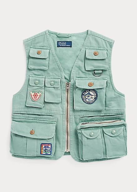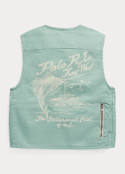 Inspired by a men’s Polo vest, this layer unites a utilitarian design with signature fishing graphics and cotton chino fabric that’s dyed for a unique, one-of-a-kind look.
