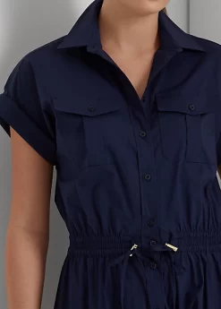 Rendered in a lightweight stretch-cotton blend, this iteration of Lauren Ralph Lauren’s iconic shirtdress features surplus-inspired pocketing and rolled cuffs for an effortless sensibility. “Lauren Ralph Lauren”-engraved buttons lend a signature touch, while an elasticated drawcord waist ensures the perfect fit. Ralph Lauren partners with Better Cottonâ„¢ to improve cotton farming globally.