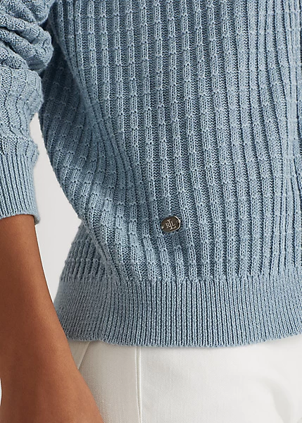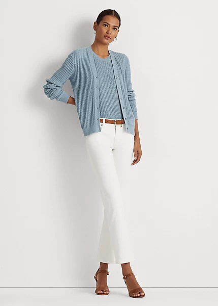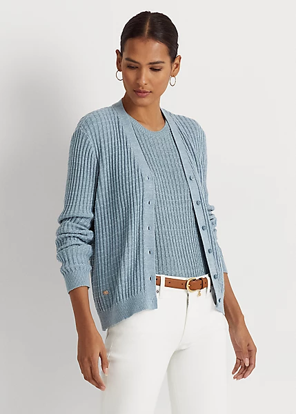 An enduring essential, this timeless cardigan is defined by a lightweight linen-and-cotton blend and a novelty textured stitch. “Lauren Ralph Lauren”-engraved buttons and an “LRL”-engraved plaque on the hem afford an iconic finish.