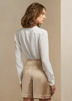 The Darien reinvents an iconic menswear staple for the modern woman. This Italian-made style unites mulberry silk crepe de chine with understated yet highly considered details, including genuine mother-of-pearl buttons, delicate shirring on the cuffs, back side pleats under the yoke and a convertible collar that reveals petite lapels when the neck button is left undone.