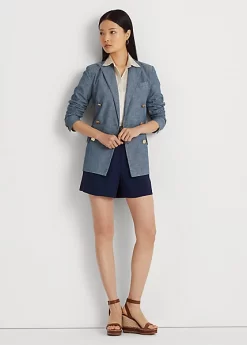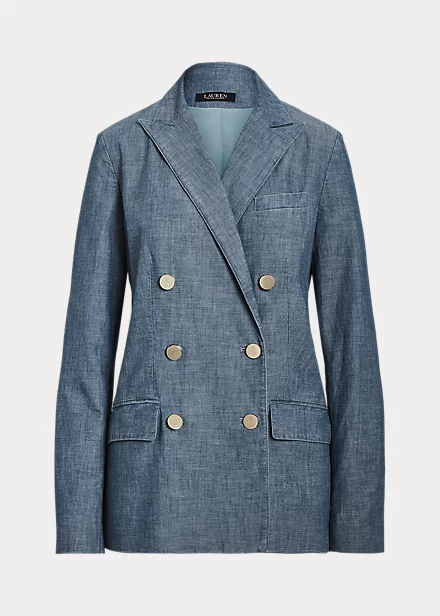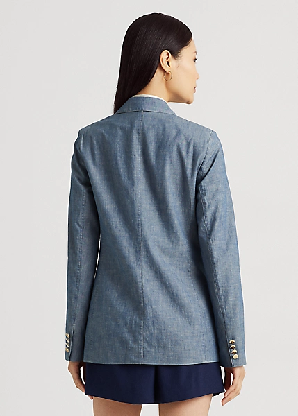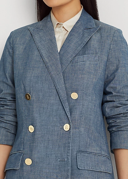 Exuding casual sophistication, this blazer merges a double-breasted silhouette and peak lapels with a lightweight chambray fabrication. Adorned with “LRL”-engraved buttons, it’s enhanced with traditional tailoring details, including waist darts and princess seams. Ralph Lauren partners with Better Cottonâ„¢ to improve cotton farming globally.