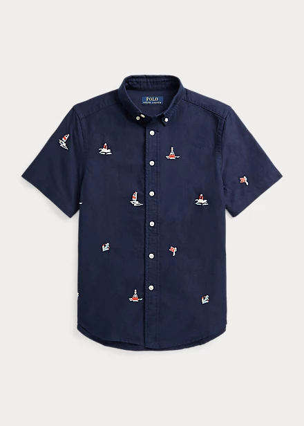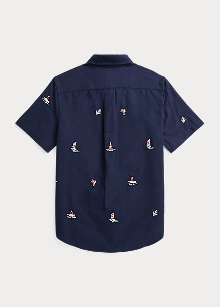 This oxford shirt features an nautical-inspired motif of sailboats, buoys and anchors embroidered all over.