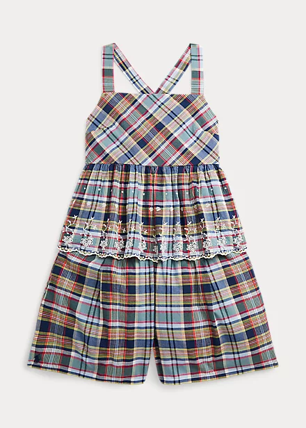 This warm-weather set includes an eyelet-embroidered top and smocked shorts – both of which are made with authentic cotton madras from India.