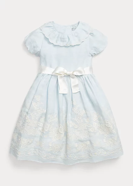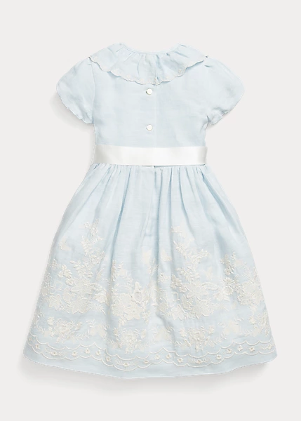 This occasion-ready dress features a ruffle overlay, a satin sash and charming embroidery of flowers and butterflies.