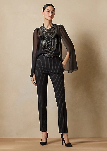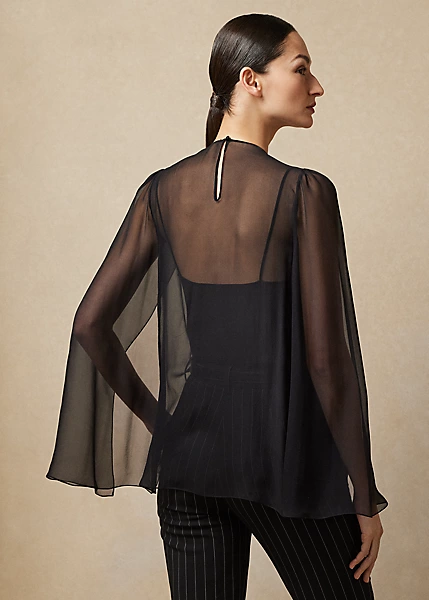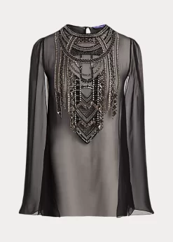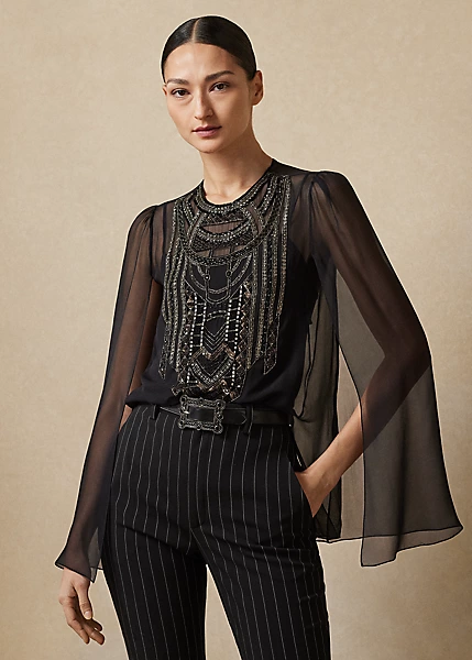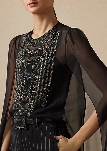 The Esmerelda blouse embodies the refined sensibility of Ralph Lauren Collection. Designed with a bevy of elevated details, this cocktail-style dinner top includes sweeping cape sleeves with a slight puff at each shoulder, a jewel neckline and a sheer silk chiffon fabrication lined with a camisole for opacity. Its breezy, lightweight fabrication – which boasts an elegant drape and subtle sheen – is meticulously hand-beaded by Italian artisans with an Art Deco-inspired motif, which is created with an array of beads and sequins.