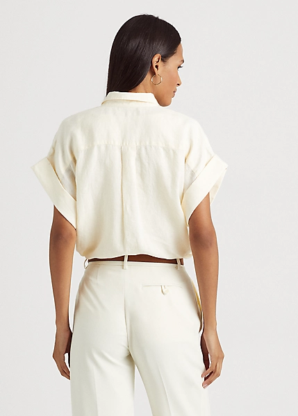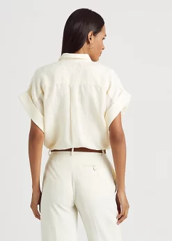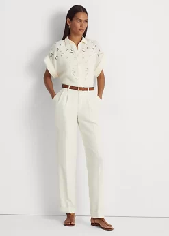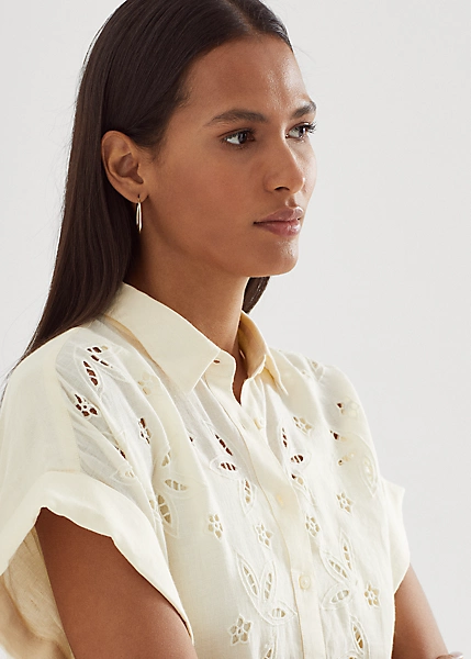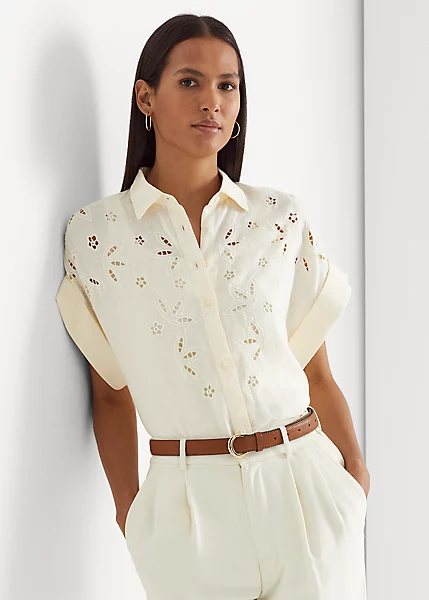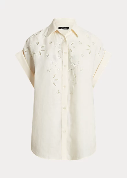 Cut for a relaxed silhouette, this short-sleeve shirt is defined by floral-inspired eyelet embroidery and an airy linen construction. “Lauren Ralph Lauren”-engraved buttons add a signature touch, while rolled cuffs and a high-low hem amplify its easy character.