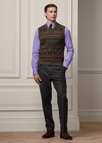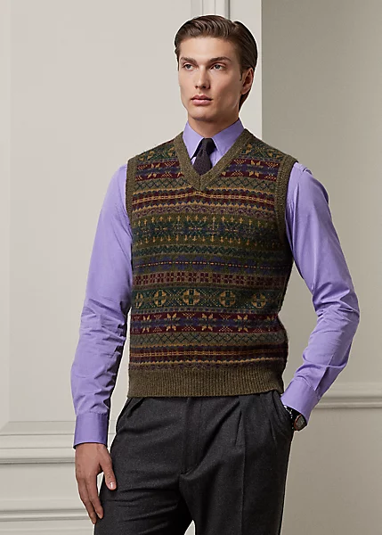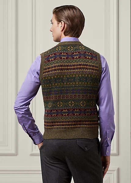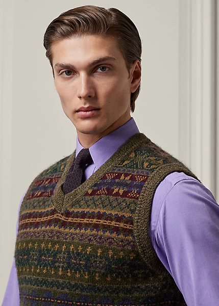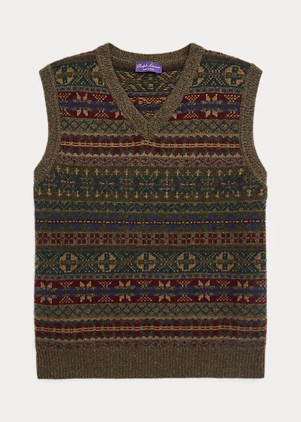 In the season’s rich colour palette, this jumper vest is jacquard-knit in Italy using thick-gauge yarns composed of soft cashmere and wool.