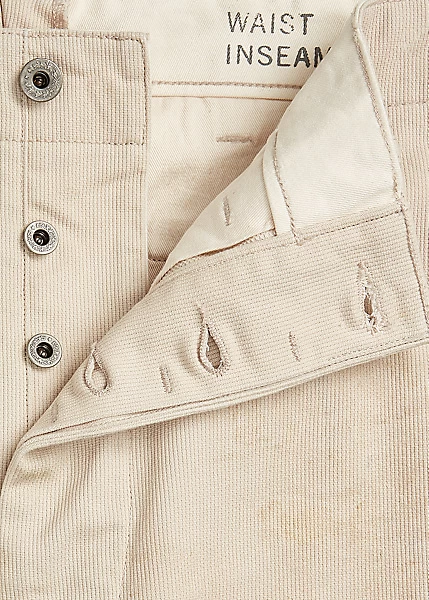 Classic-fitting trousers made from lightweight Bedford cord fabric. Inspired by utilitarian field trousers from the 1940s. Distressed throughout.