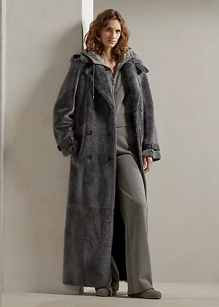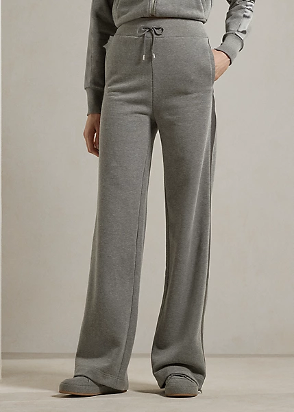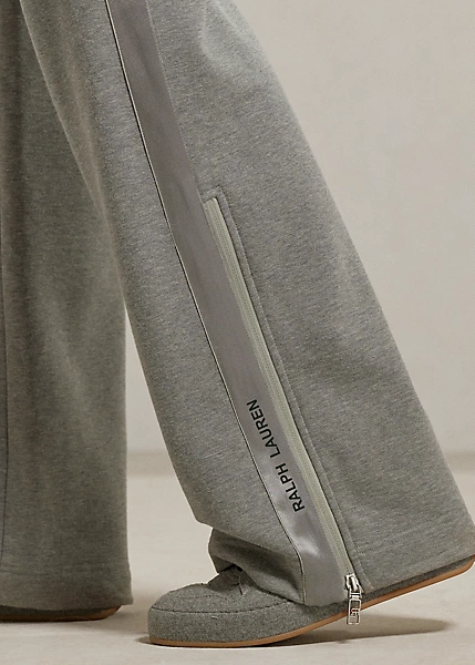 Designed with a mid-rise and a wide-leg fit, this athletic trouser combines Ralph Lauren Collection’s luxurious style with a sporty sensibility. Featuring a comfortable elastic waistband, front waist pockets and vented hems with a zipped closure, this elevated tracksuit bottom is finished with a bevy of signature elements, including “Ralph Lauren”-engraved grommets, a lamb-suede drawcord with “RL”-engraved cord ends and a concealed “Ralph Lauren”-printed logo on the hems. It’s crafted with soft fleece in the season’s grey hue and trimmed with satin stripes down the side seams.