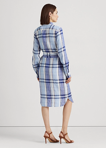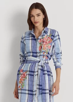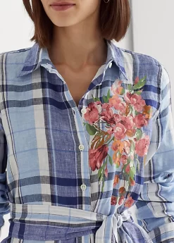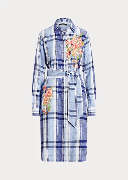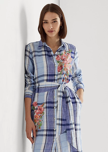 The season’s take on Lauren’s iconic shirtdress is crafted with lightweight linen and pairs a yarn-dyed plaid motif with an elegant floral print. Accented with signature buttons, it’s finished with a waist-defining self-belt.