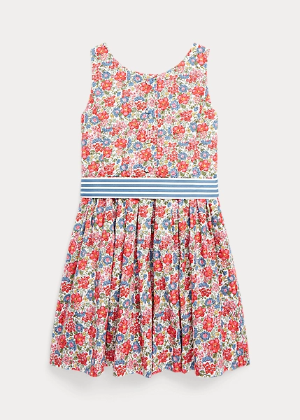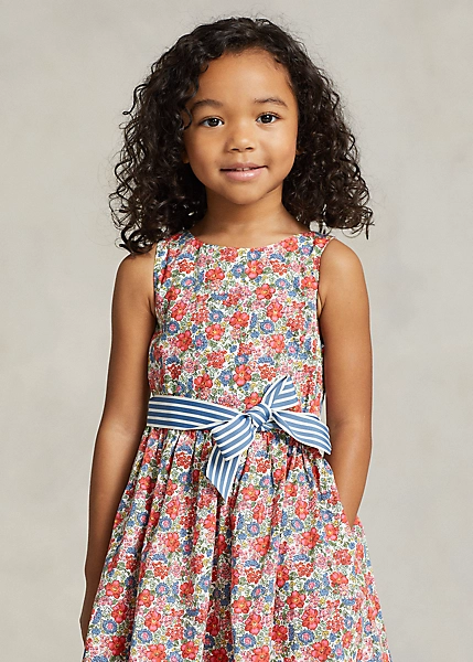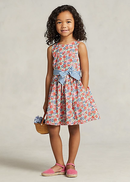 A sweet pick for warm-weather occasions, this cotton poplin dress features a cheery floral print and coordinating grosgrain sash. Ralph Lauren partners with Better Cottonâ„¢ to improve cotton farming globally. Better Cotton trains farmers to use water efficiently, care for the health of the soil and natural habitats, reduce use of the most harmful chemicals and implement the principles of decent work.