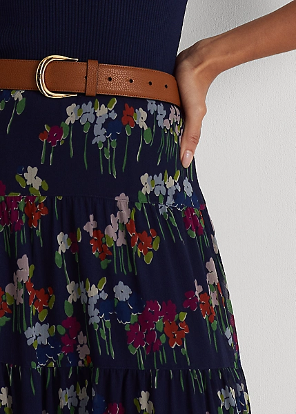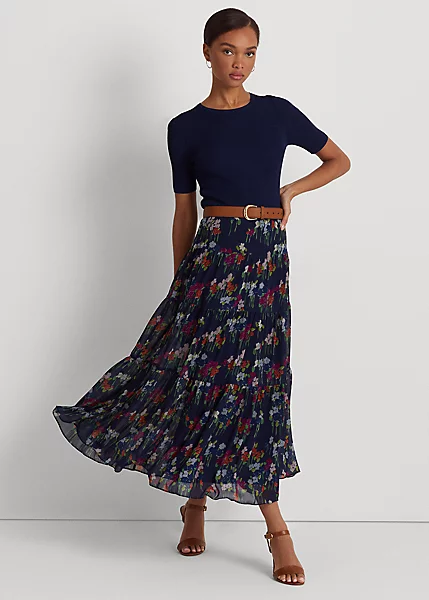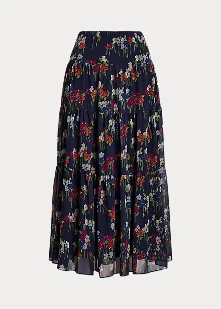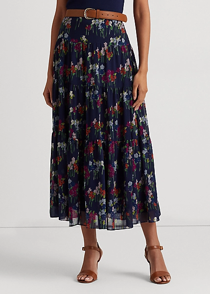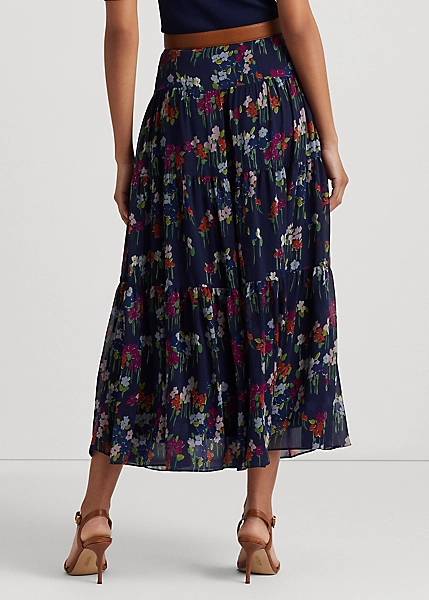 The season’s floral motif enhances the romantic sensibility of this calf-grazing skirt, while a crinkle georgette fabrication and a tiered silhouette lend graceful movement with each step.