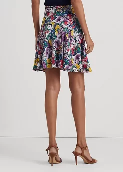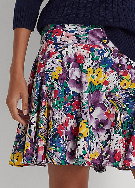 Lightweight georgette and godets bring fluid movement to this thigh-grazing skirt, while the season’s vibrant floral motif affords a feminine sensibility.