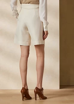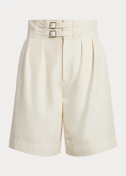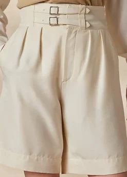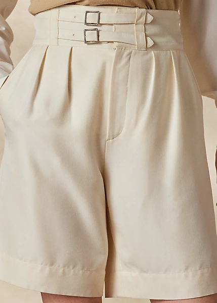 Designed with a Gurkha-inspired buckled waistband and oversized pleats, the Francine shorts are rendered with silk shantung – a lightweight fabrication defined by its distinctive slub texture.
