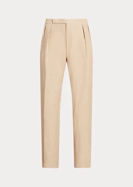 These pleated trousers are hand-tailored in Italy with a textured linen twill that is custom-developed for Ralph Lauren and reminiscent of a traditional sharkskin pattern.
