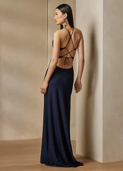 Sleek silhouettes and a modern sensibility serve as defining characteristics of the Summer 2023 Collection, realised here in this jumper evening gown. Knit with a matte crepe yarn that effortlessly sculpts the body, this form-fitting dress is elevated by a lace-up halter silhouette and dramatic cutouts, which draw inspiration from vintage swimwear.