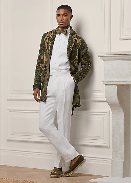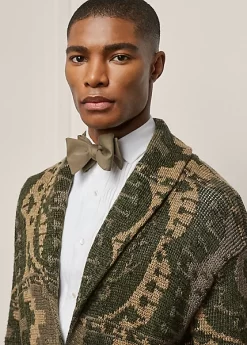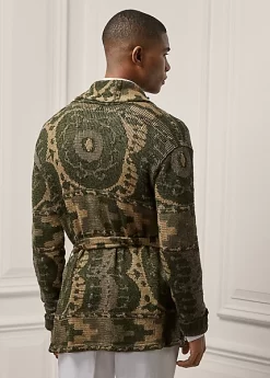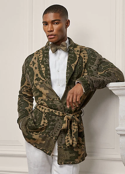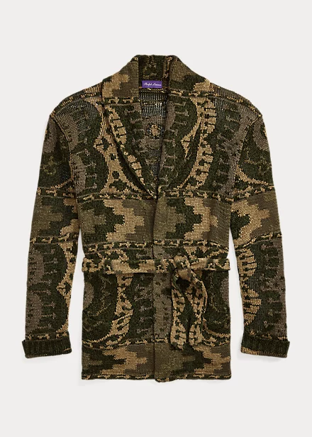 This belted cardigan features an intricate pattern inspired by designs traditional to Uzbekistan and cultures throughout Central Asia. The interwoven global history of Ikat techniques – from as early as the tenth century – holds cherished historical symbolism and varied origins across cultures in the Middle East, Asia, Africa and Latin America.