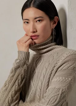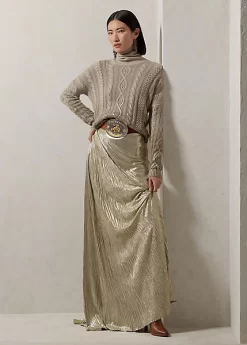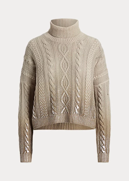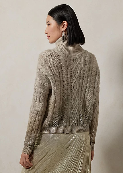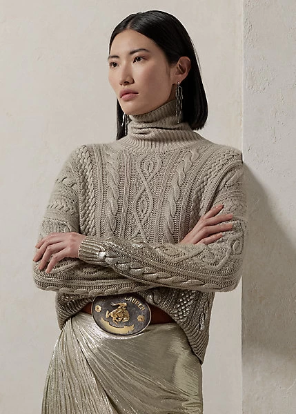 Our iconic cable-knit roll neck jumper is revamped for the Fall 2023 season with a boxy fit and dropped shoulders for a comfortable feel. Spun with our signature lofty cashmere, this jumper is hand-painted with metallic paint in an ombré effect that starts on the hem then flows beautifully upwards into the body, showcasing Ralph Lauren’s commitment to the highest quality of craftsmanship.