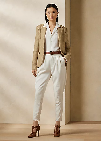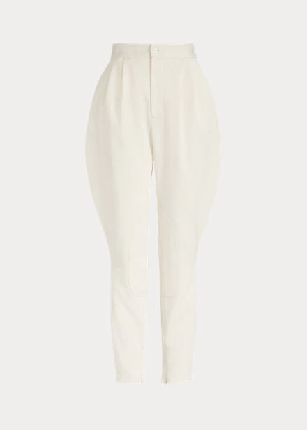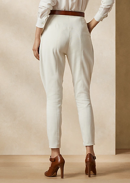 Since the debut of our Equestrian collection for women in 1985, the romance of distinguished riding attire has been a source of inspiration for Mr Lauren. The Harrison, inspired by an Autumn 2012 Collection trouser, reinterprets traditional jodhpurs with a slimmer silhouette and double front waist pleats. Rendered from a cavalry twill fabrication and lined with mulberry silk satin, these high-rise trousers are designed with authentic details, like self-patches and iconic Ralph Lauren finishing touches, including a signature mother-of-pearl button.