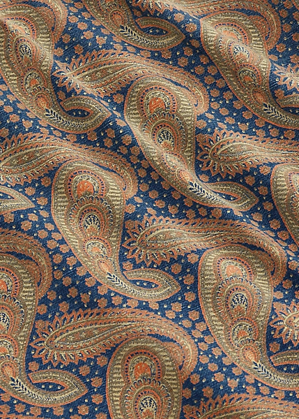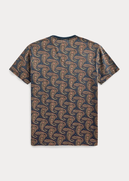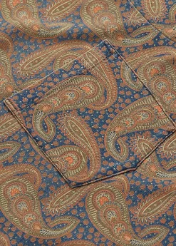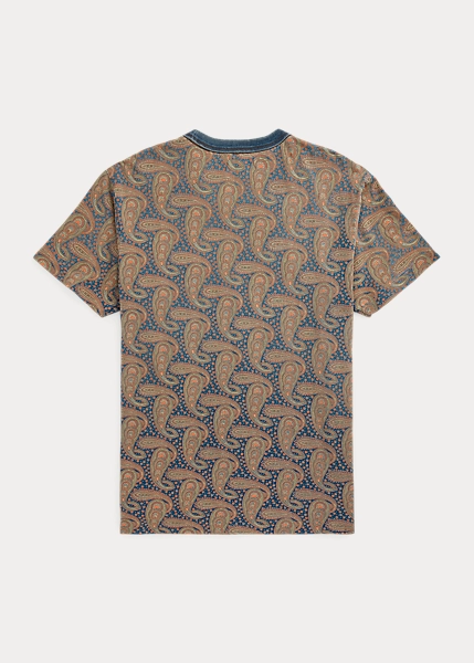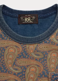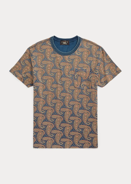 Made with cotton jersey that is yarn-dyed with true indigo. Paisley pattern is printed using multiple techniques. All-over rinse wash.