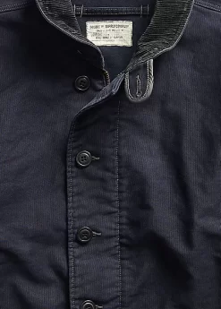 Based on a nautical deck jacket. Made from jungle cloth, a durable grosgrain-weave fabric used in flight apparel. Updated details include a half-lined interior and Japanese buttons. Fine-wale corduroy collar. Dyed and tint-washed for subtle colour variations throughout.