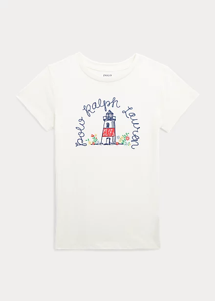 Washed for softness, this cotton tee features “Polo Ralph Lauren” chain-stitched alongside a lighthouse print and embroidered flowers. Ralph Lauren partners with Better Cottonâ„¢ to improve cotton farming globally. Better Cotton trains farmers to use water efficiently, care for the health of the soil and natural habitats, reduce use of the most harmful chemicals and implement the principles of decent work.