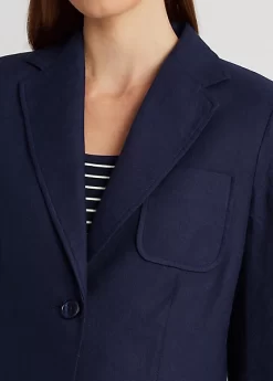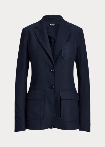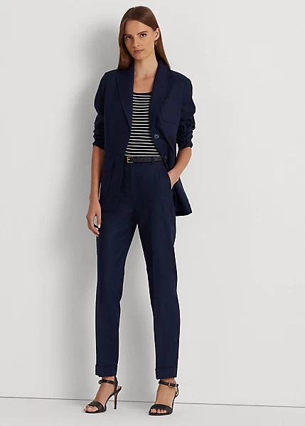 Lightweight linen-blend twill brings subtle texture to this elegant blazer, which features a menswear-inspired silhouette, shoulder pads and a two-button closure. Traditional tailoring details, including waist darts and princess seams, enhance its polished look.
