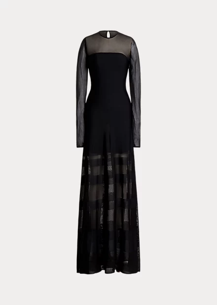 A modern eveningwear piece, this stunning gown is designed with a timeless A-line silhouette, a crewneck and long sleeves. Expertly knit in one piece, this Italian-made gown uses a combination of matte and sheer yarns, creating a contemporary juxtaposition between opacity and transparency.