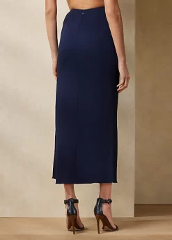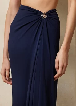 An iconic Ralph Lauren silhouette, the Margarethe revamps the sarong skirt with a Riviera-inspired sensibility. Rendered in fluid jersey for a flattering fit, this calf-grazing skirt features a fixed drape and a diamond-shaped ornament centred by Ralph Lauren’s stacked monogram.