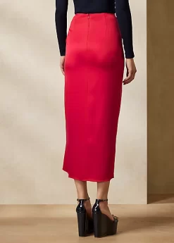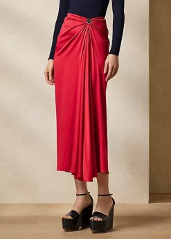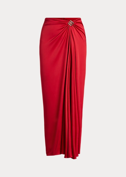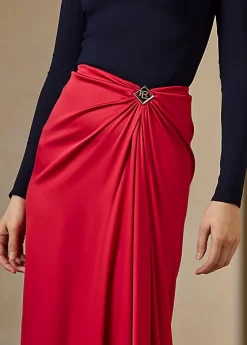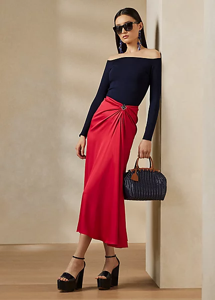 An iconic Ralph Lauren silhouette, the Margarethe revamps the sarong skirt with a Riviera sensibility. Rendered in stretch-infused silk charmeuse that’s specially washed for a subtle sheen, this calf-grazing skirt features a fixed drape and a diamond-shaped ornament centred by Ralph Lauren’s stacked monogram.