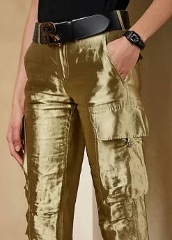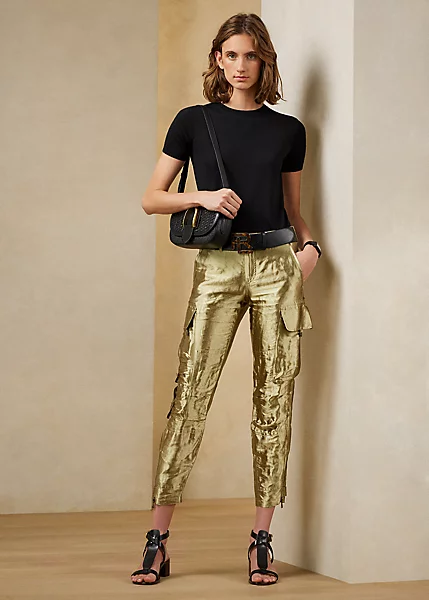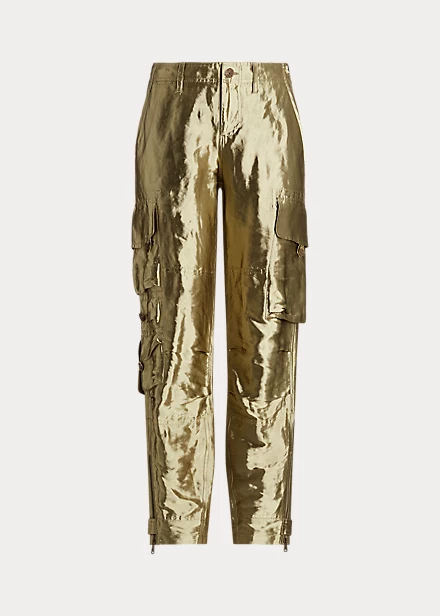 Surplus-inspired style has long informed Mr Lauren’s designs, and this season he builds on that code with the Mitchell, which showcases four cargo pockets on the thigh. This style is rendered from the season’s metallic organza and is distinguished by its slim silhouette, buckled waist tabs and a zip on each hem.