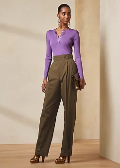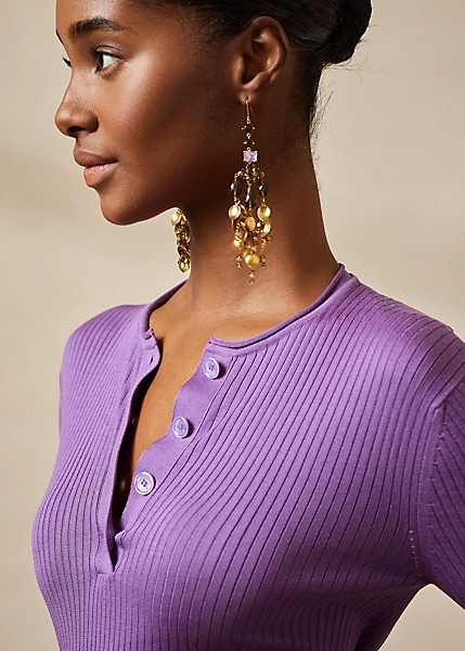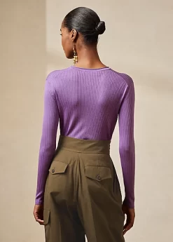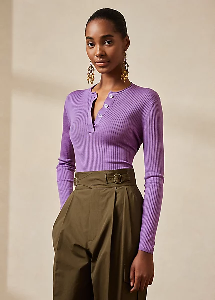 This Henley jumper is knit from mulberry silk in an ultra-fine rib to create a flattering silhouette. Featuring a jersey roll detail on the neck, this long-sleeve jumper is embellished with genuine mother-of-pearl buttons engraved with “Ralph Lauren”.