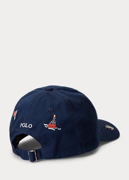 This twill cap is washed for comfort and embroidered with a nautical motif of sailboats, anchors and buoys.