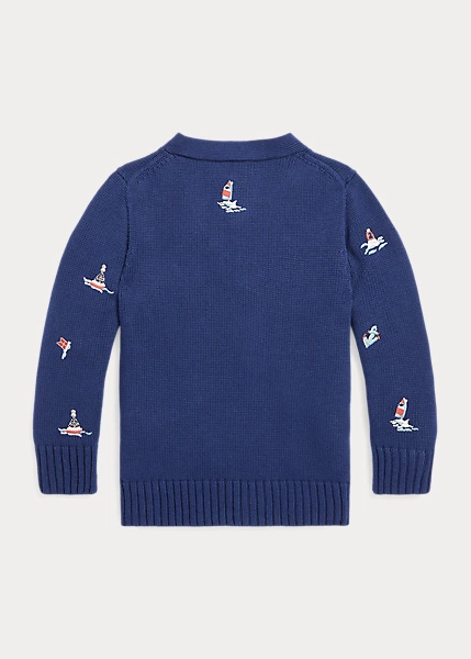 This cardigan is made with ultra-soft combed cotton and embroidered with a nautical motif of sailboats, anchors and buoys. Ralph Lauren partners with Better Cottonâ„¢ to improve cotton farming globally. Better Cotton trains farmers to use water efficiently, care for the health of the soil and natural habitats, reduce use of the most harmful chemicals and implement the principles of decent work.