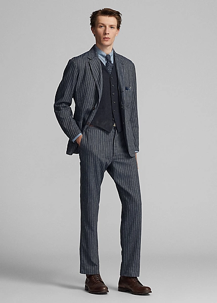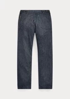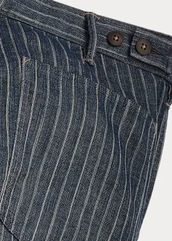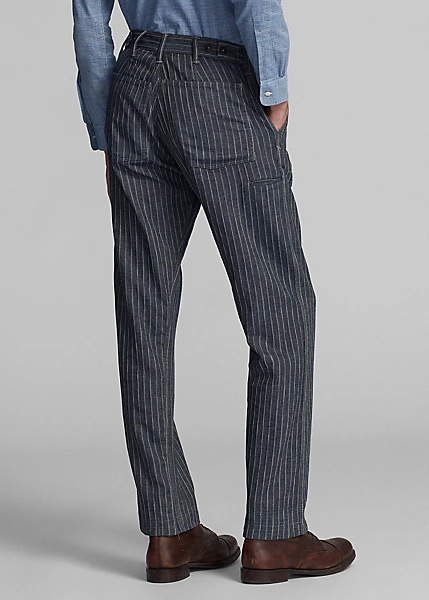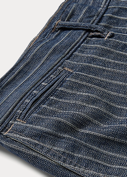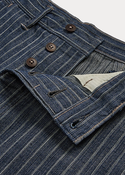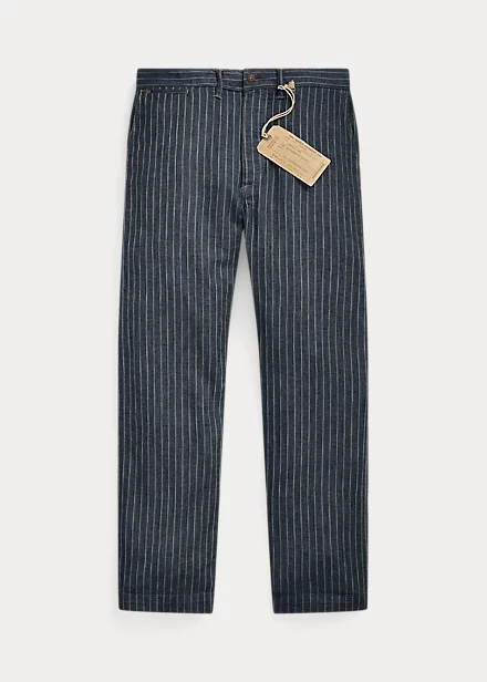 Trim-fitting trousers with a straight leg. Made with striped cotton-and-linen herringbone cloth from Japan. Yarn-dyed with indigo and washed. Finished with corozo buttons.