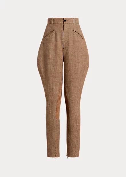 Since the debut of our Equestrian collection for women in 1985, the romance of distinguished riding attire has been a source of inspiration for Mr Lauren. The Owens, a new-season trouser for Pre-Fall 2023 Collection, reinterprets traditional jodhpurs with a vintage-inspired feel, which is realised in its slimmer silhouette and high rise. The trouser’s tick-weave fabrication is woven with an Italian silk-blend tweed, resulting in a subtle texture and lightweight feel. Its small-scale pattern – created using two contrasting colours – affords an elegant touch, while chamois lamb-suede patches on each leg create an authentic equestrian sensibility.