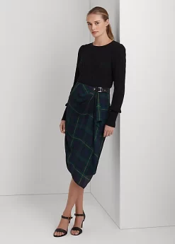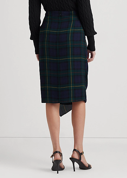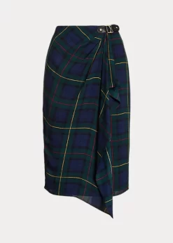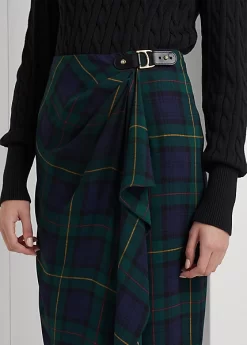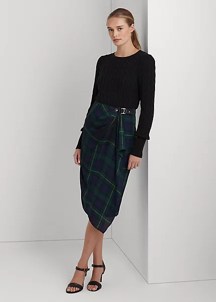 The season’s plaid motif and a faux-leather “LRL”-engraved buckled embellishment on the left waist lend sophistication to this knee-grazing skirt, while a delicate georgette fabrication affords graceful movement and fluidity.