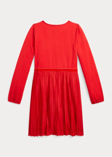 A pleated skirt and plaid trim on the waist give this stretch jersey dress a festive look for the season.
