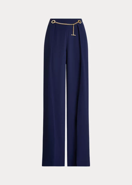 Rendered in double-faced georgette for a graceful drape and polished look, this stylish trouser is cut for a flattering high rise and a breezy wide-leg silhouette. Crisp pleats and a glistening chain self-belt on the waist enhance its elegant appeal.
