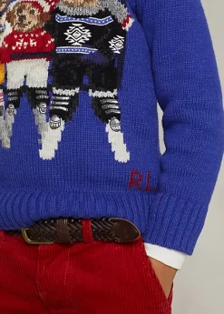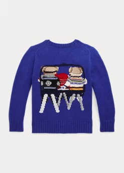 This crewneck jumper features a Polo Bear family on a ski lift intarsia-knit on the front and back.