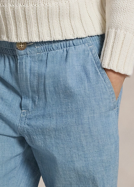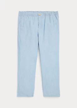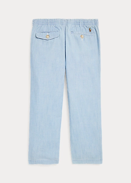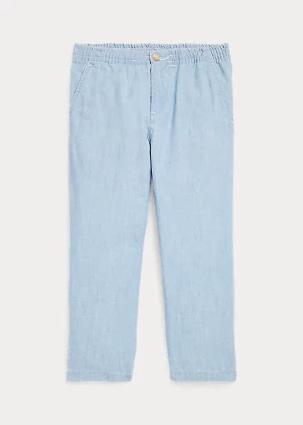 These trousers are made with washed cotton chambray and embroidered with our multicoloured signature Pony. Ralph Lauren partners with Better Cottonâ„¢ to improve cotton farming globally. Better Cotton trains farmers to use water efficiently, care for the health of the soil and natural habitats, reduce use of the most harmful chemicals and implement the principles of decent work.